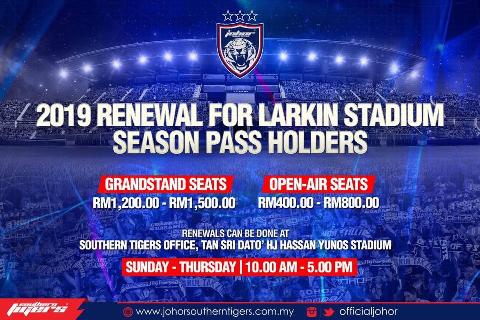 We are pleased to inform all 2018 season pass holders at the Tan Sri Dato Haji Hassan Yunos Stadium, Larkin can renew their passes for next year (2019). [1/3]