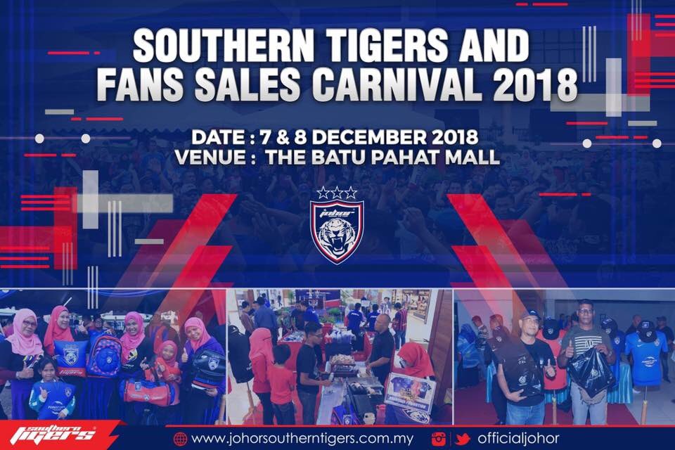 A Southern Tigers and Fans Sales Carnival 2018 will be held for two days on the 7th and 8th of December at the Batu Pahat Mall, Johor. Johor Darul Ta'zim FC (JDT) fans and the people of Johor can buy official merchandise by Southern Tigers Sdn Bhd at special prices. [1/2]