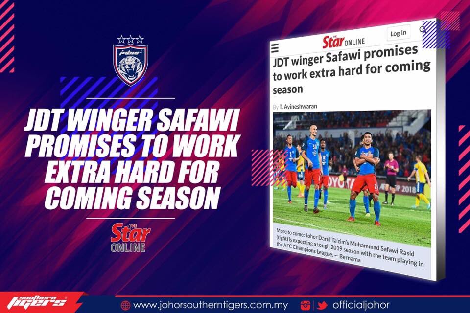 English daily The Star reported today that Johor Darul Ta'zim FC (JDT) winger Safawi Rasid is doubling his efforts ahead of an important 2019 season that brings AFC Champions League (ACL) football to Larkin. [1/5]