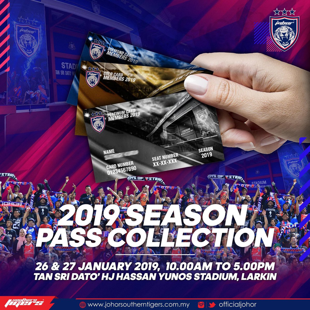 Johor Darul Ta'zim FC fans who have already made their payment for 2019 season passes can collect the passes on 26th and 27th January at the Dewan Gemilang, Tan Sri Dato' Haji Hassan Yunos Stadium, Larkin. [1/3]