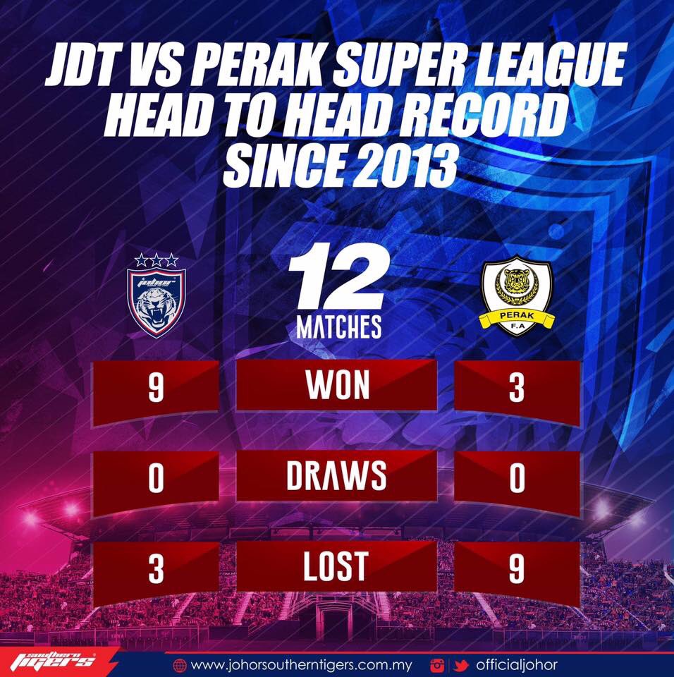 Johor Darul Ta'zim FC (JDT) have faced Perak 12 times in the Super League since the club was founded in 2013. [1/4]