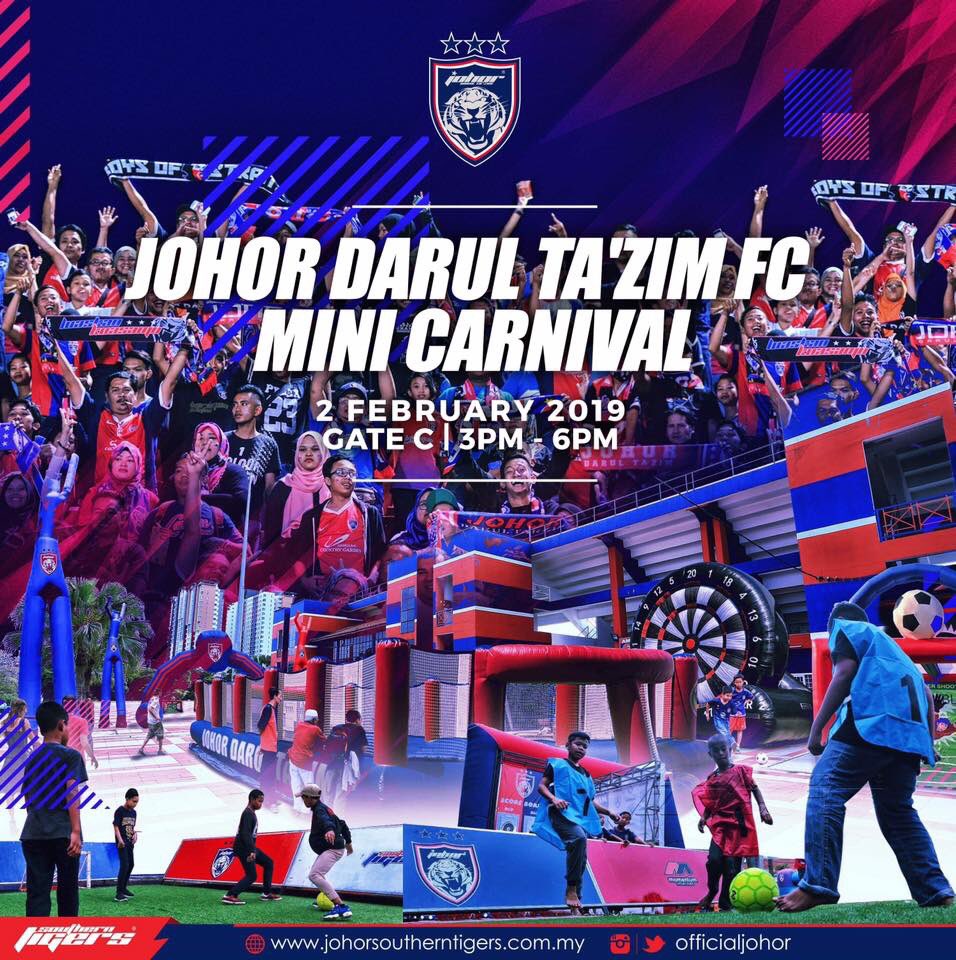 Johor Darul Ta'zim FC (JDT) will have a JDT mini carnival this Saturday, 2nd February 2019 in conjunction with the Charity Cup match between Johor Darul Ta'zim FC and Perak. Fans of both teams are welcomed to liven up the mini carnival. [1/3]
