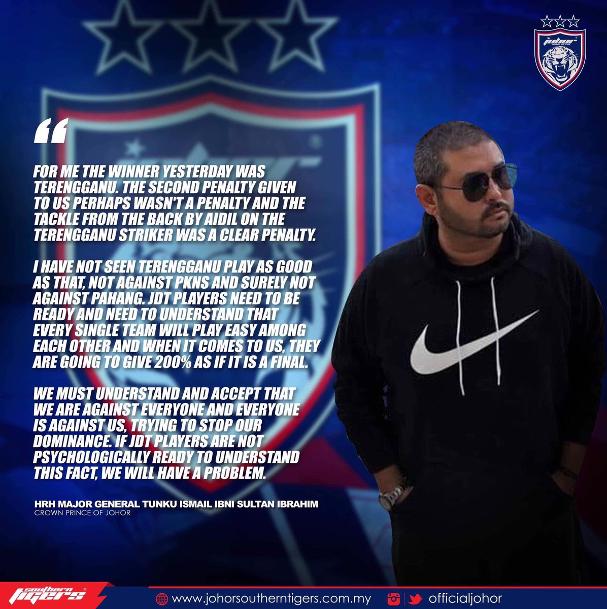 We must understand and accept that we are against everyone and everyone is against us, trying to stop our dominance. If JDT players are not psychologically ready to understand this fact, we will have a problem.