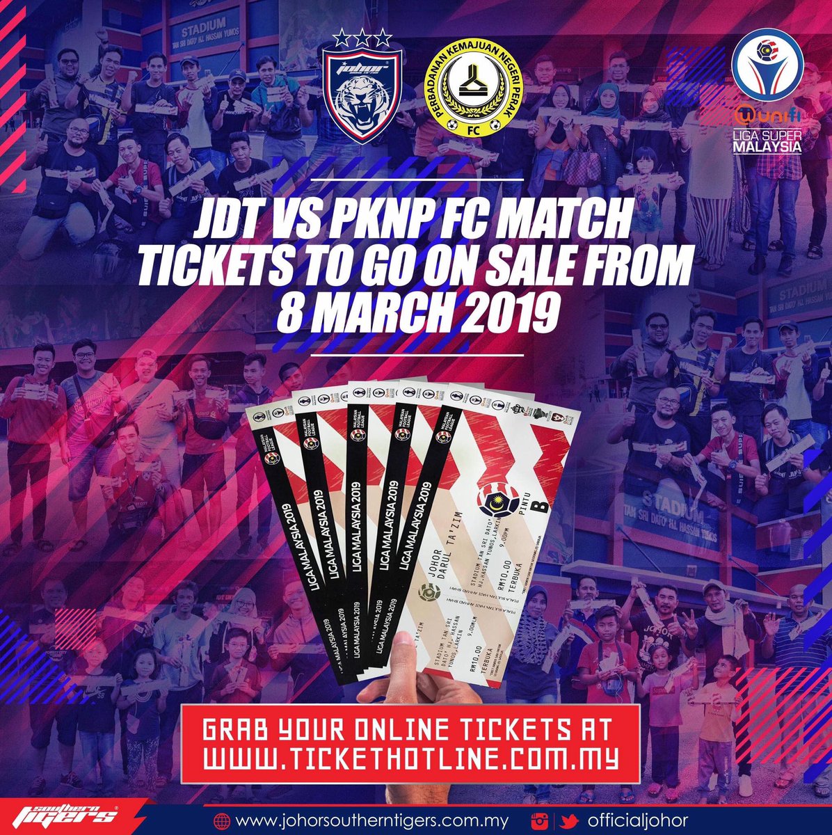 Tickets to watch an unifi Liga Super Malaysia 2019 between JDT and PKNP FC will go on sale at ticketing counters from 9.00am on 8th of March 2019. Don't miss your opportunity to watch the match at the Tan Sri Dato' Haji Hassan Yunos Stadium, Larkin on 9th March. [1/2]