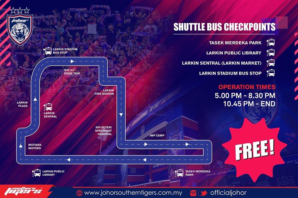 The shuttle bus service will begin from 5.00pm to 8.30pm and resume from 10.45pm until all the fans leave. Luaskan Kuasamu Johor.