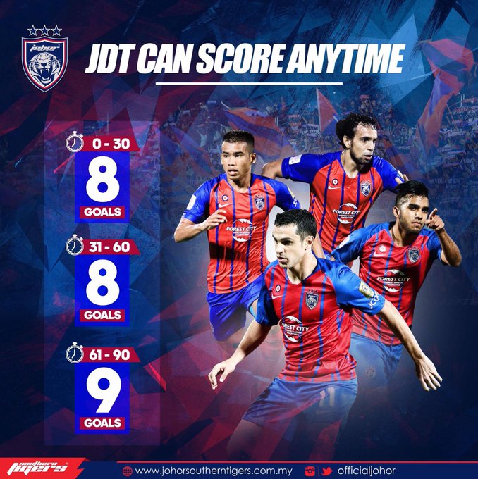 If 30-minute blocks were considered, JDT have scored 8 in the first 30 minutes, 8 in the second and 9 in the final half-hour of matches.