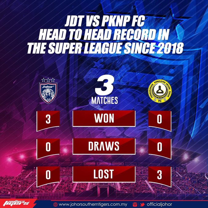 Based on the head to head record from the three meetings, JDT recorded wins in all matches. JDT have scored eight goals and conceded just once against PKNP throughout the history of their past encounters.