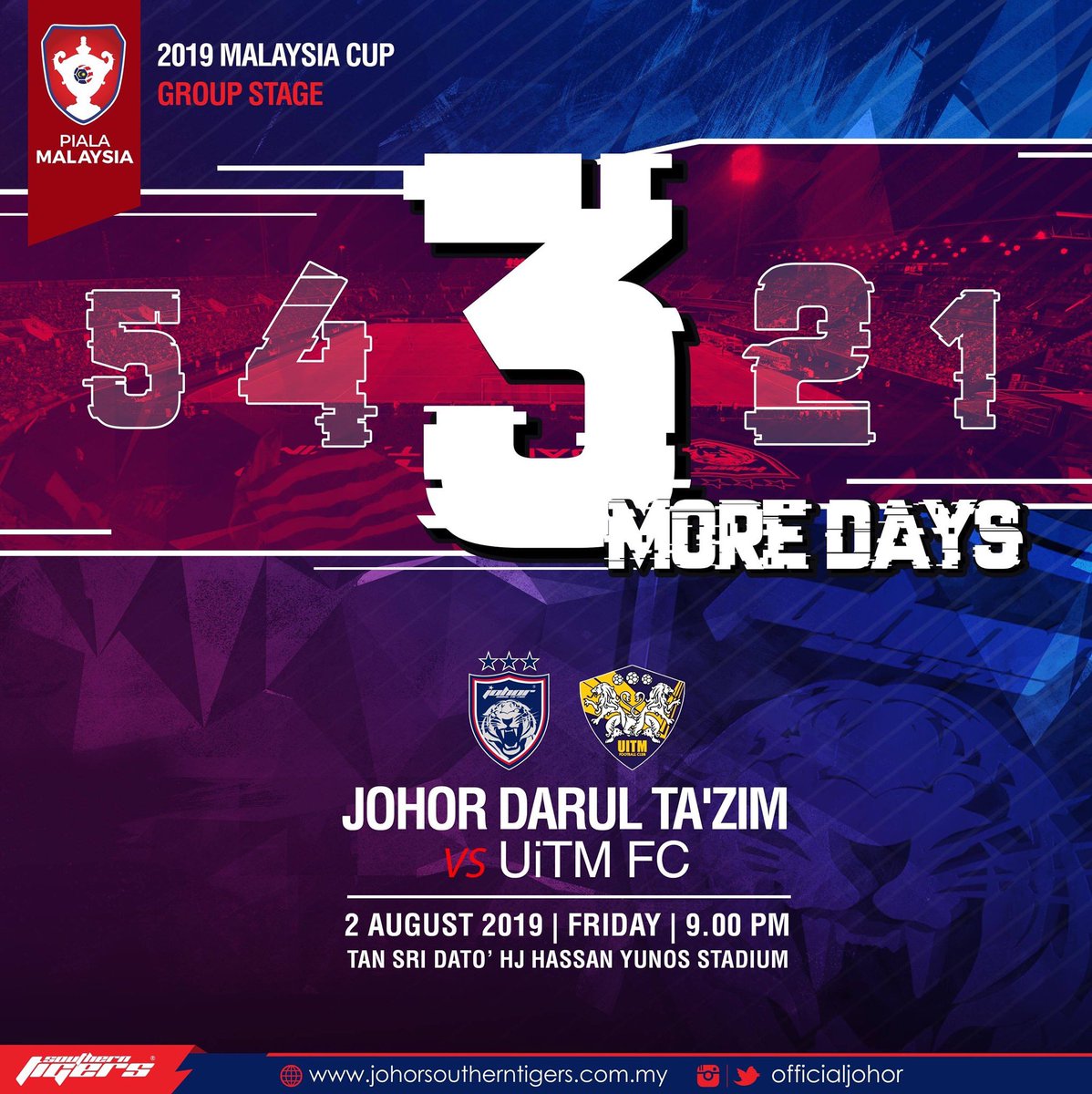3 more days to go to the 2019 Malaysia Cup match between JDT and UiTM FC at the Tan Sri Dato' Haji Hassan Yunos Stadium, Larkin on the 2 August 2019.