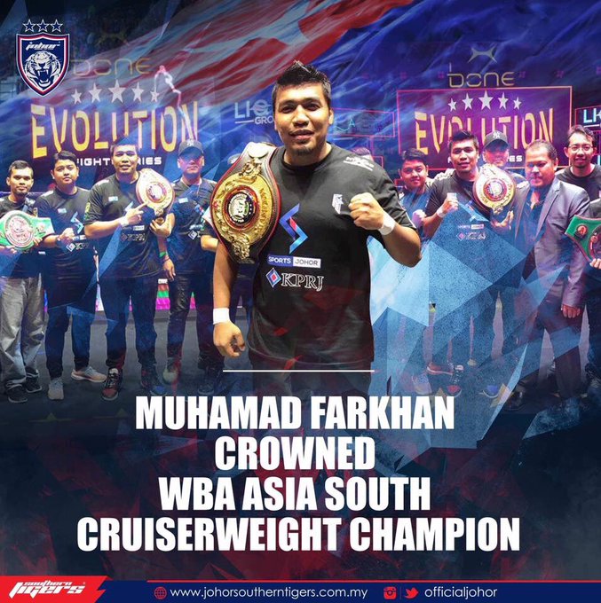 Congratulations to Johor-born professional boxer Muhamad Farkhan ‘The Southern Tiger’ Haron, who was crowned the WBA Asia South Cruiserweight champion after defeating Alexander Bajawa of Indonesia in a title fight in Pattaya, Thailand on 30 June 2019. [1/2]