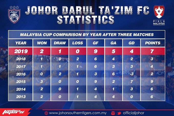 In comparison to 2018, JDT only had four points and six goals at the same stage. In the 2017 Malaysia Cup winning campaign, JDT collected four points and scored six goals after three group matches.