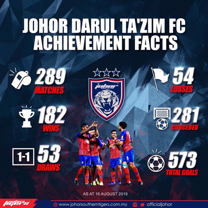 From the total, JDT won 182 matches, drew 53 and lost 54 matches. 573 goals were scored and 281 goals were conceded. Luaskan Kuasamu Johor.