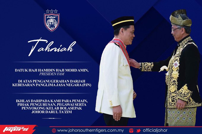 Congratulations to Datuk Haji Hamidin Haji Mohd Amin, President of the Football Association of Malaysia (FAM), for being conferred a Panglima Jasa Negara (PJN) title.