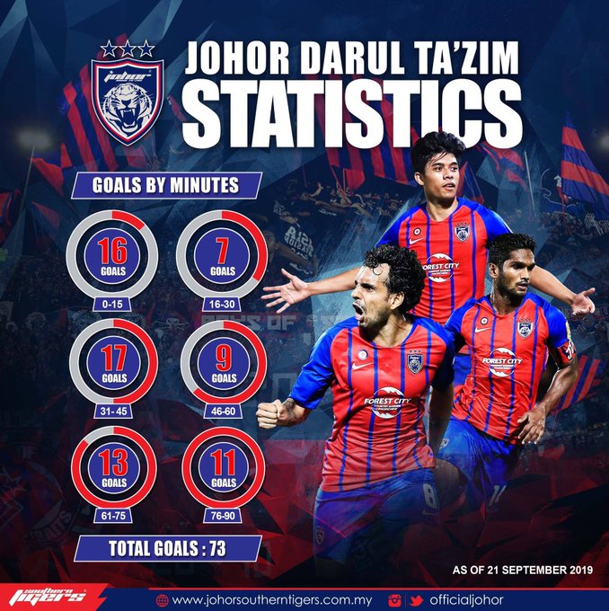 JOHOR DARUL TA'ZIM STATISTICS - GOALS BY MINUTES September 23, 2019 Dapatkan pautan Facebook X Pinterest E-mel Apl Lain JOHOR DARUL TA'ZIM STATISTICS - GOALS BY MINUTES *as of 21 SEPTEMBER 2019 Hidup Johor Demi Johor #HarimauSelatan #SouthernTigers #PermataSelatan #JewelOfTheSouth #JDTuntukSemua #JDTforAll Ulasan