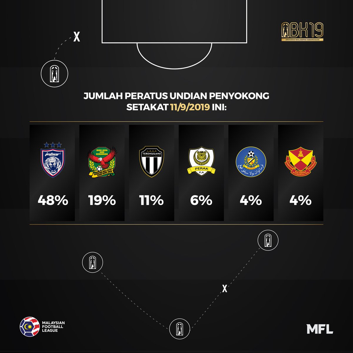 Berikut merupakan jumlah peratusan undian 'FAN XI" setakat ini berdasarkan pasukan sokongan anda.
