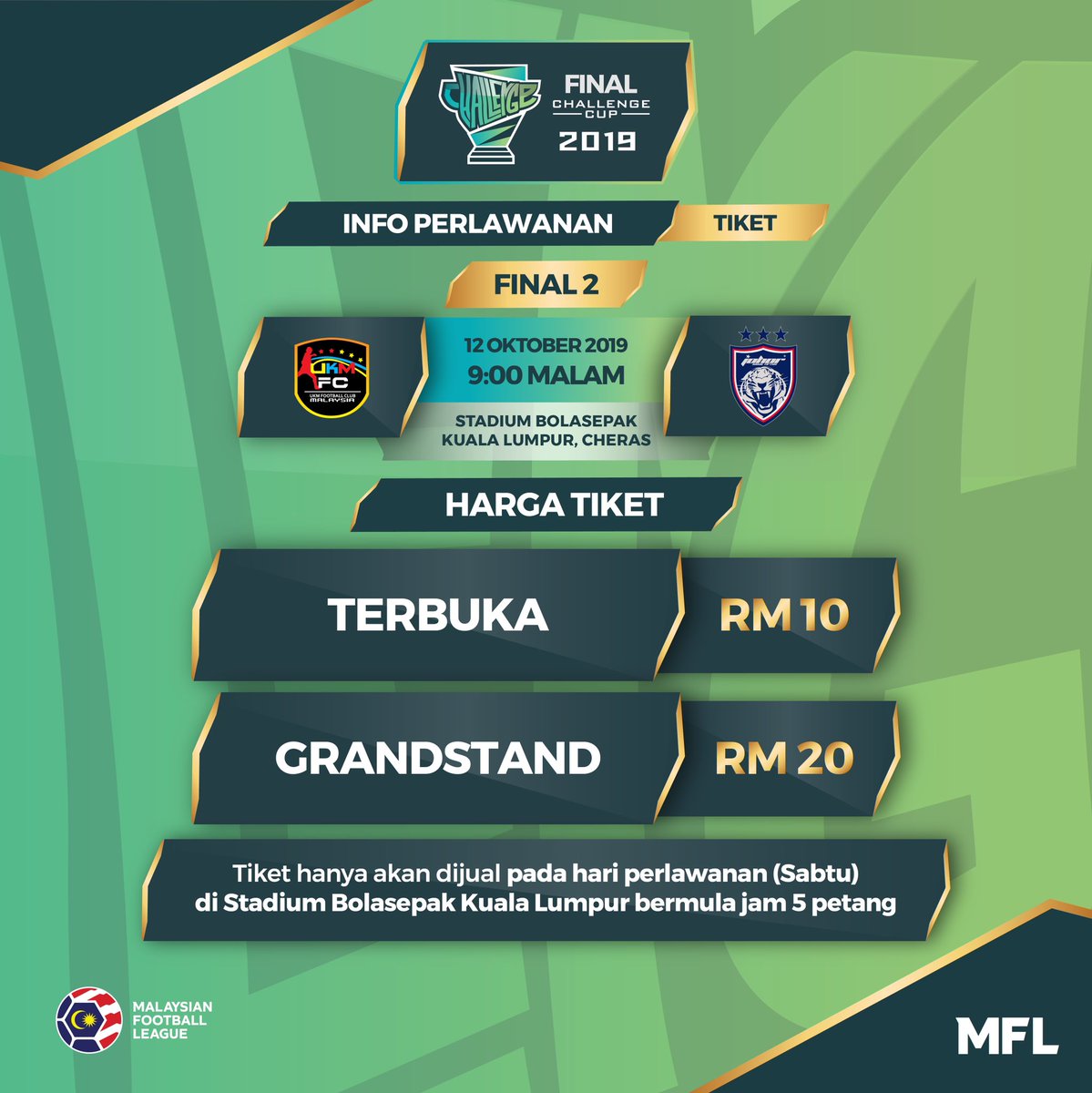 🎫 INFO TIKET FINAL 2 CHALLENGE CUP 2019 Oktober 12, 2019 Dapatkan pautan Facebook X Pinterest E-mel Apl Lain INFO TIKET FINAL 2 CHALLENGE CUP 2019 Kaunter tiket di Stadium Bolasepak Kuala Lumpur akan dibuka bermula jam 5 petang nanti! #ChallengeCup2019 Ulasan