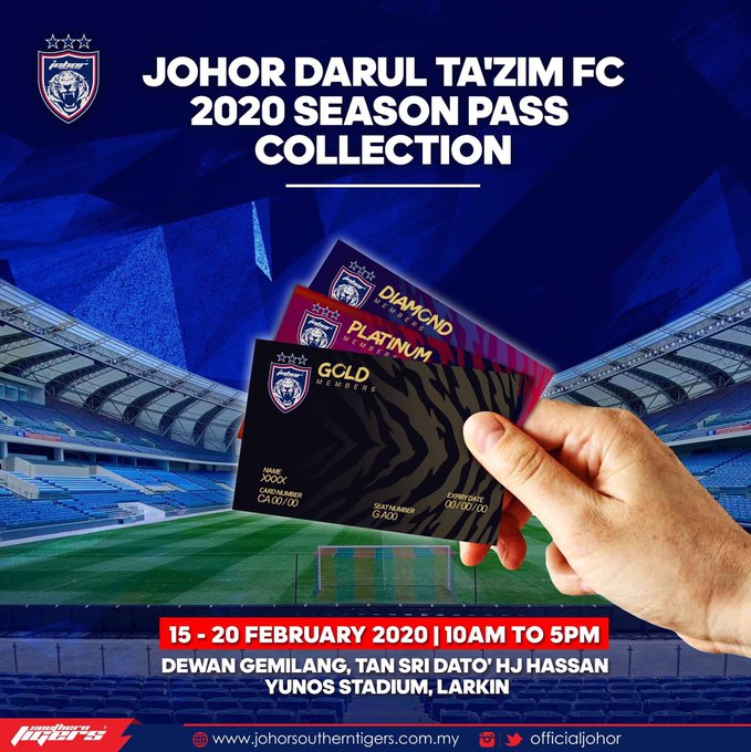 Johor Darul Ta'zim FC (JDT) fans who have made payment for the JDT 2020 Season Pass can collect their passes from February 15 - 20 at Dewan Gemilang, Tan Sri Dato' Haji Hassan Yunos Stadium, Larkin. [1/2]