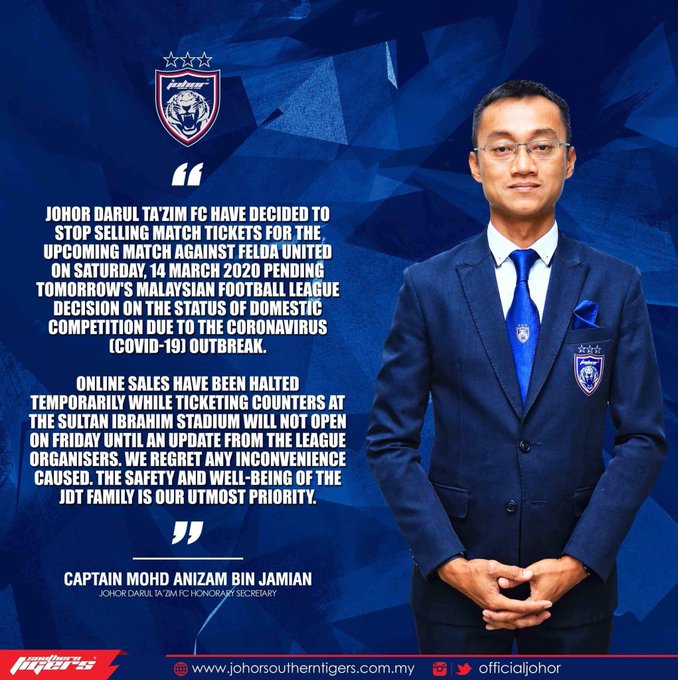 Johor Darul Ta'zim FC have decided to stop selling match tickets for the upcoming match against Felda United on Saturday, 14 March 2020 pending tomorrow's Malaysian Football League decision on the status of domestic competition due to the Coronavirus (COVID-19) outbreak. [1/3]